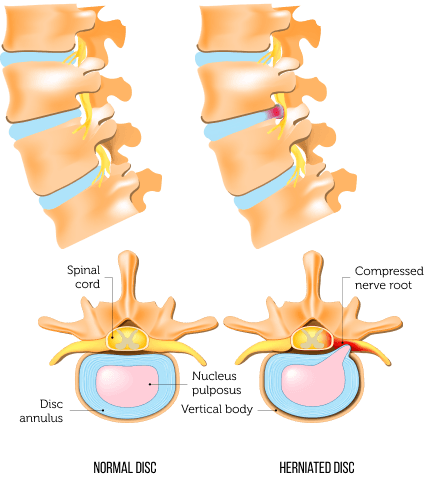 A slipped disc is when the soft cushion of tissue between the bones in your spine pushes out. As it protrudes it can cause a compression of one of your spinal nerves which can lead to numbness and pain.